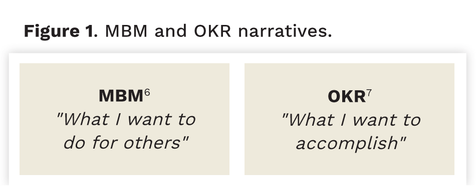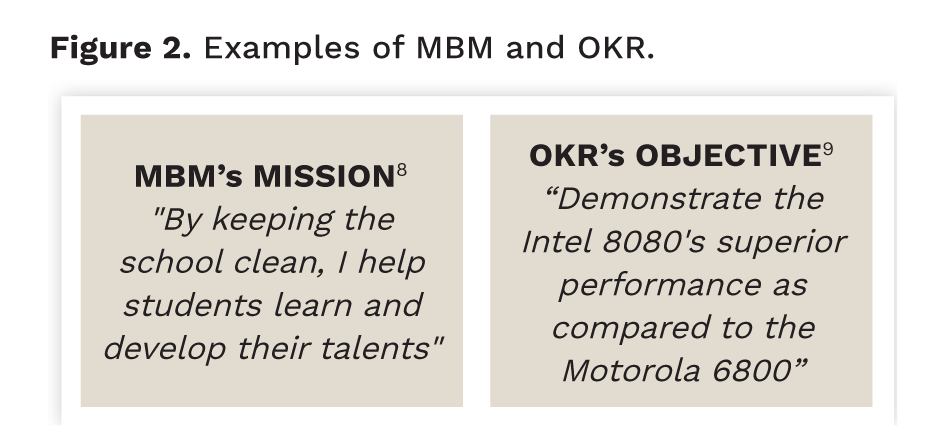 The following examples illustrate the OKR and MBM in practice (see Figure 2). The first is an objective developed by John Doerr when he worked at Intel Corporation. The second is a mission created by an ISS janitor at a school in Denmark. In both cases, the employees define their aspirations, but their underlying narratives are quite different.