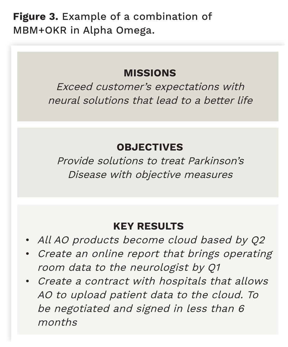 This is the case, for example, at Alpha Omega (AO), an Israeli company that makes high-tech medical devices that help treat brain disorders such as Parkinson’s disease. Employees combine OKR and MBM systems. When setting their goals, employees first define their missions and then set specific objectives and key results for each of their missions (see example in Figure 3).