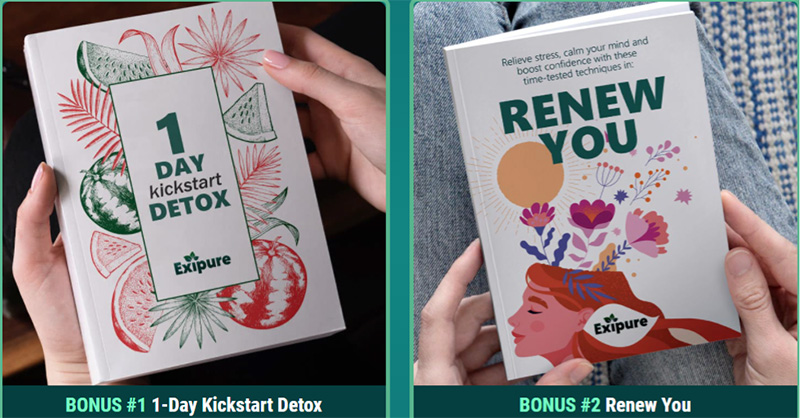 - Bonus 1: 1-Day Kickstart Detox ($59.95 value): The eBook offers a quick guide on how to detox, cleanse, and flush organs to support absorption and kickstart your Exipure journey. The guide provides 20 bizarre 15-second detox tea recipes.