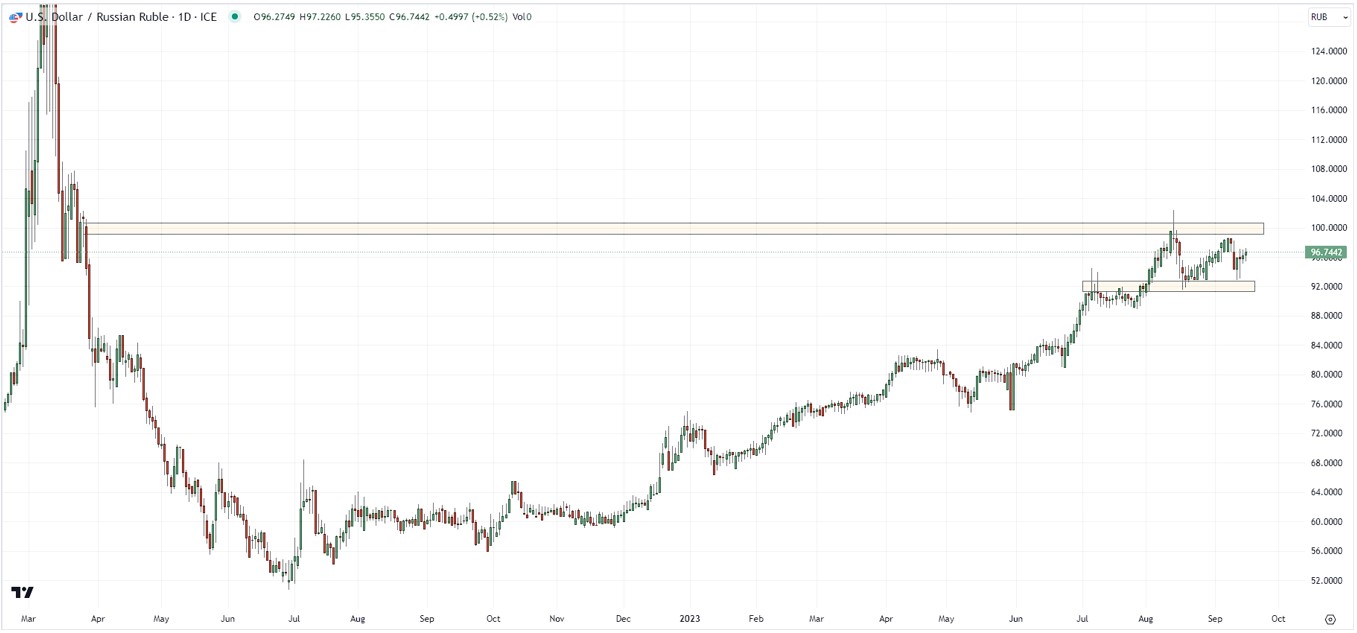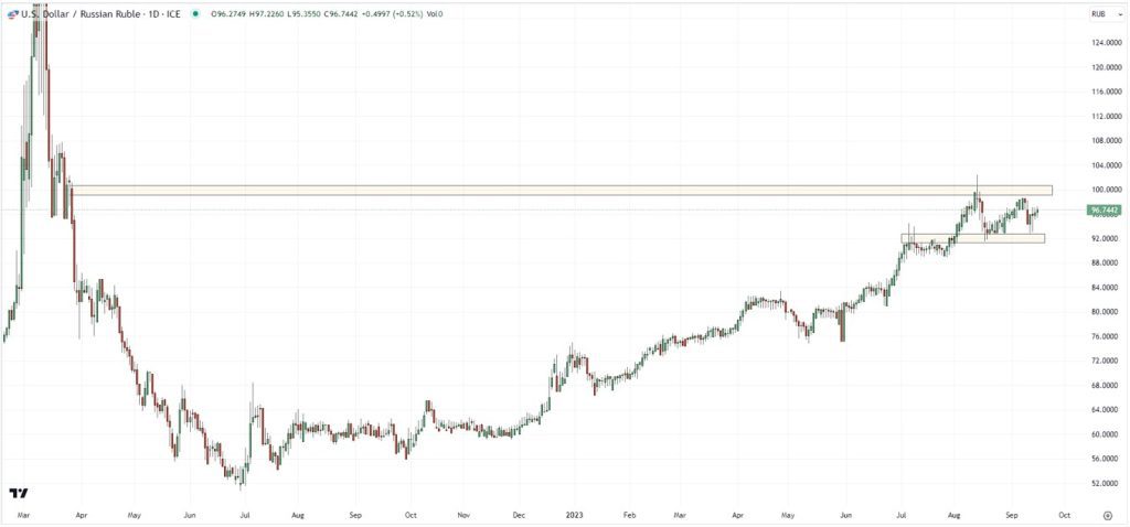 The USD/RUB pair stands as one of the most significant currency duos across the globe, though it doesn’t rank as the most liquid. It reflects the ratio of the value of the US dollar to the Russian ruble and is of interest to both currency traders and investors. Even more so, it serves as a barometer for Russia’s economic health.