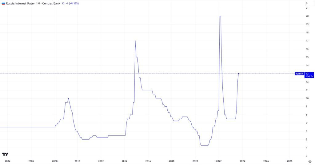 On September 15, a report of the Central Bank of Russia regarding a shift in the interest rates was released, as scheduled in the economic calendar. The current rate now stands at 13%, marking the fourth consecutive increase. This represents a 1% uptick compared to the previous month.