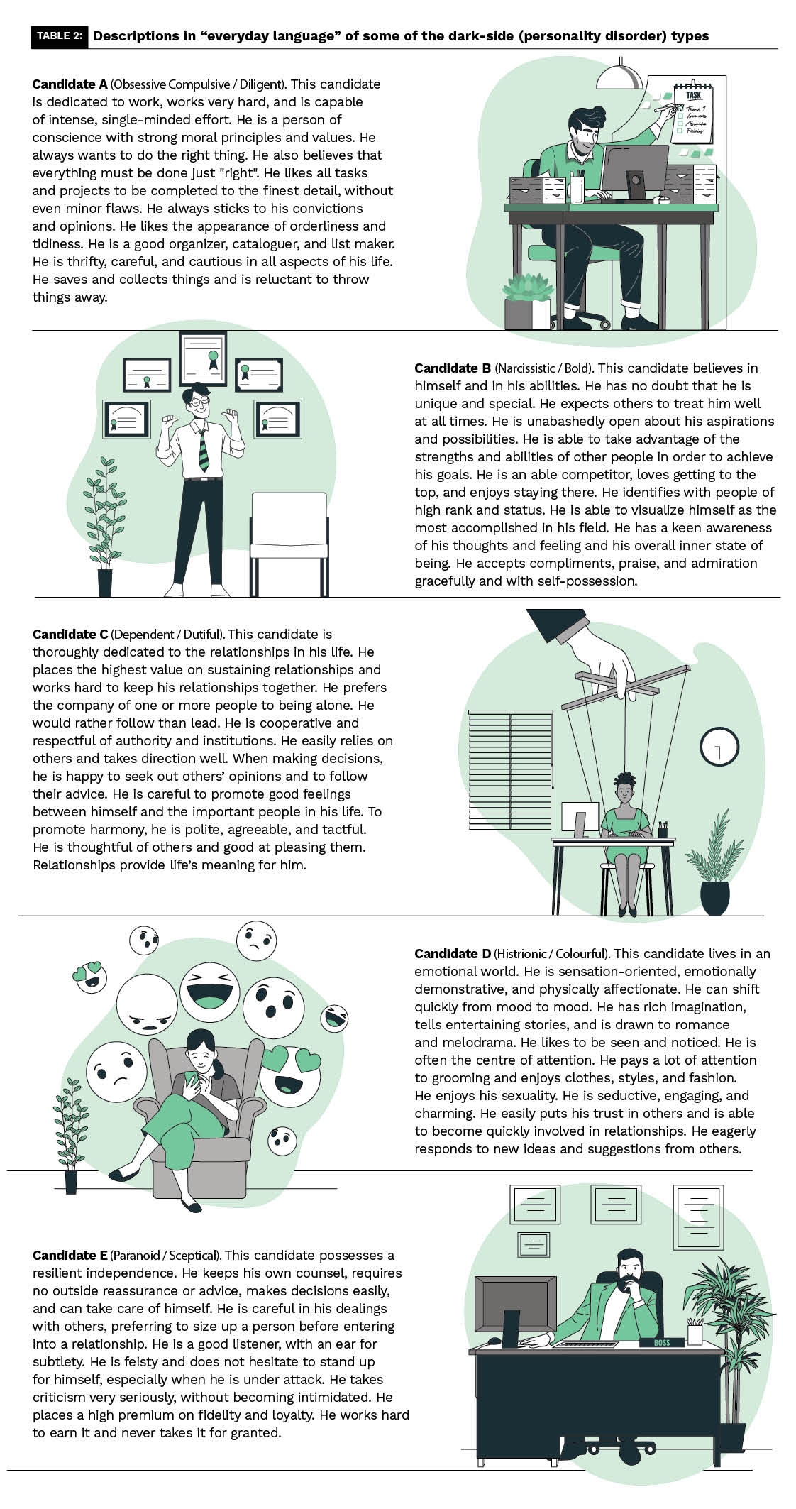 A few years ago, I conducted some studies on what can be called “the dark fit”. I was interested in what ordinary people thought were “good / ideal / fitting jobs” for those with specific dark sides. It was quite simple. I gave people “rich descriptions” of an individual based on the psychiatric literature (see table 2). One study used 11, another 10. These are examples of the descriptions. They were all males.