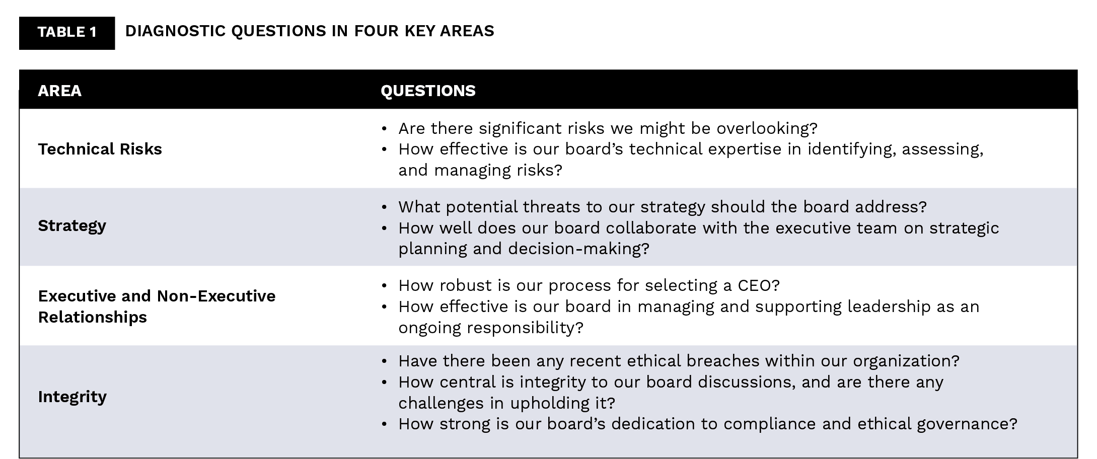 This section outlines four critical areas where boards often underperform. Table 1 offers diagnostic questions to assess specific sources of board failures to identify and address potential vulnerabilities.