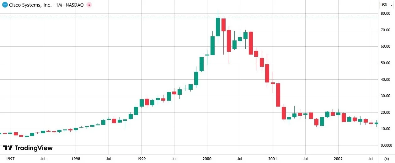 Burry compares Nvidia to Cisco Systems during the 2000 dot-com bubble. Both companies reached extremely high valuations at their peak, with Nvidia currently obtaining the leading position on the stock screener. In the case of Cisco Systems, these valuations proved to be wrong, as they were based on unrealistic expectations of future demand. Cisco Systems saw its stock collapse by 78% once it became clear that the enormous spending on infrastructure would not generate the hoped-for profits, since there wasn’t adequate demand to sustain it.