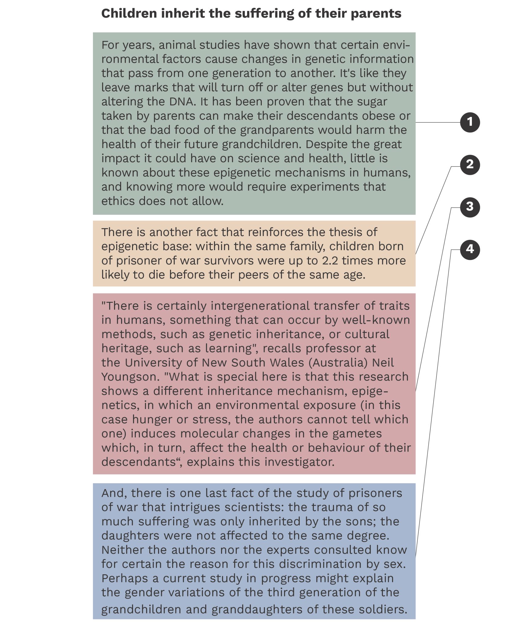 There are many similar anecdotes with experience in human beings. Children who have experienced the horrors of wars can go beyond fear of war of other generations. There are also many stories that lead to a common syndrome, called “the second-generation syndrome”, of the Holocaust survivors. Although there is no scientific research that clearly shows the mechanism by which phobias, fears, and other extreme experiences are transmitted through generations, through the transmission of the “memory ” of the experiences of ancestral generations, more and more theories about this are becoming known. Recent research with animals seems to provide “convincing” evidence of the biological transmission of such “memory”, along with associated brain changes, of adult male mice that was evidenced with their children and then grandchildren.