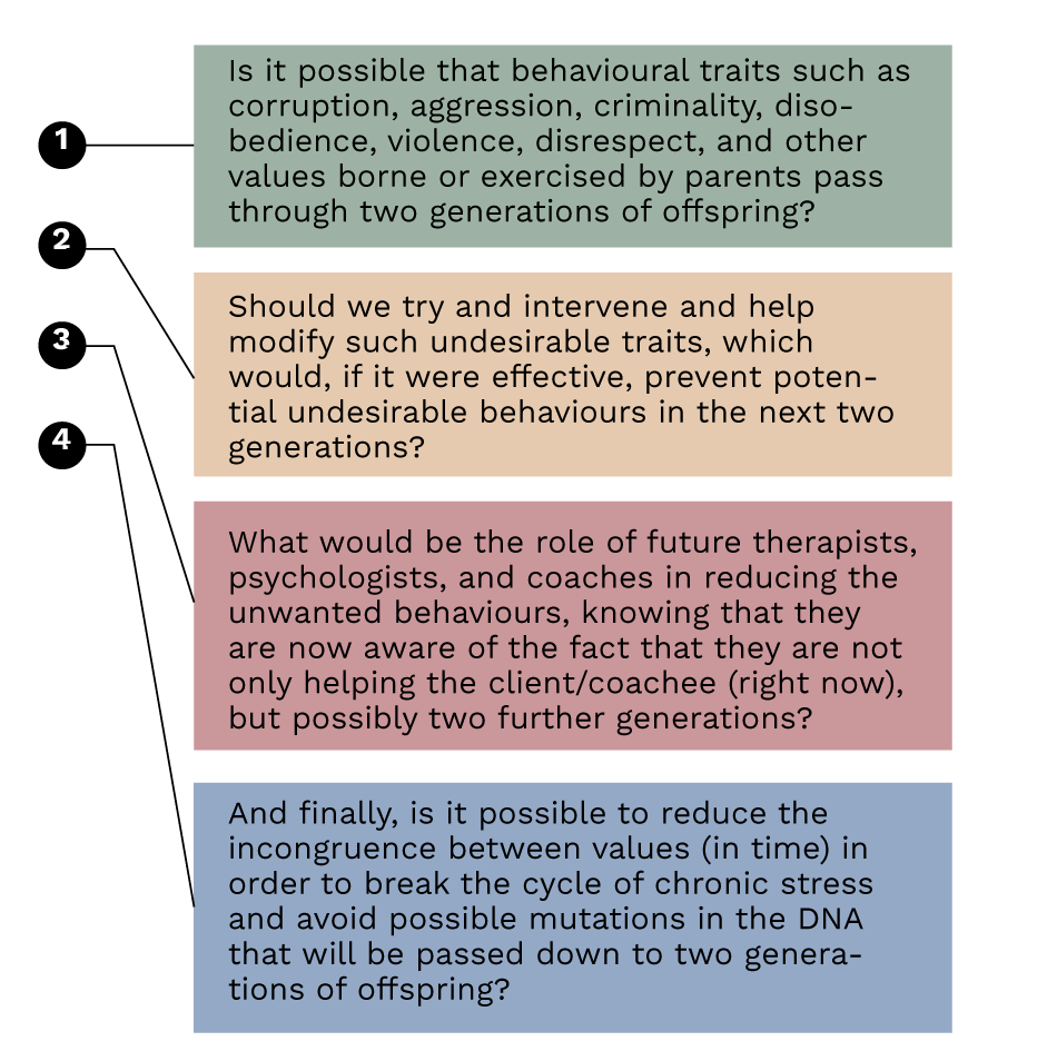 Honestly, our intuition in response to all these questions / propositions is yes. Imagine the consequences for coaches and other health professionals. Now, if they do good work in diagnosing value incongruence and signs and symptoms of chronic stress, not only will they be helping a coachee/client/patient to overcome their problems and have a better quality of life, but indirectly they are helping their children and the children of their children. Wow! This is heavy stuff!7