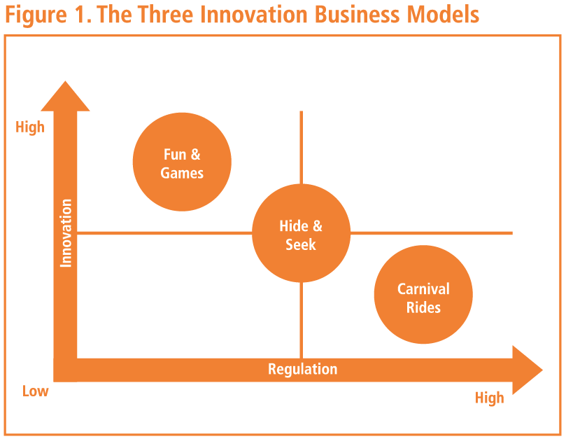 After a careful study of businesses within heavily regulated spaces and interviews with top executives, three innovation business models emerge: 1) Fun & Games; 2) Hide & Seek; 3) Carnival Rides. Each business model reflects different constraints from regulation and different levels of potential impact. Rapid innovation and most disruptions usually come from the first two business models. The ability to scale up in regulated environments comes from the third.