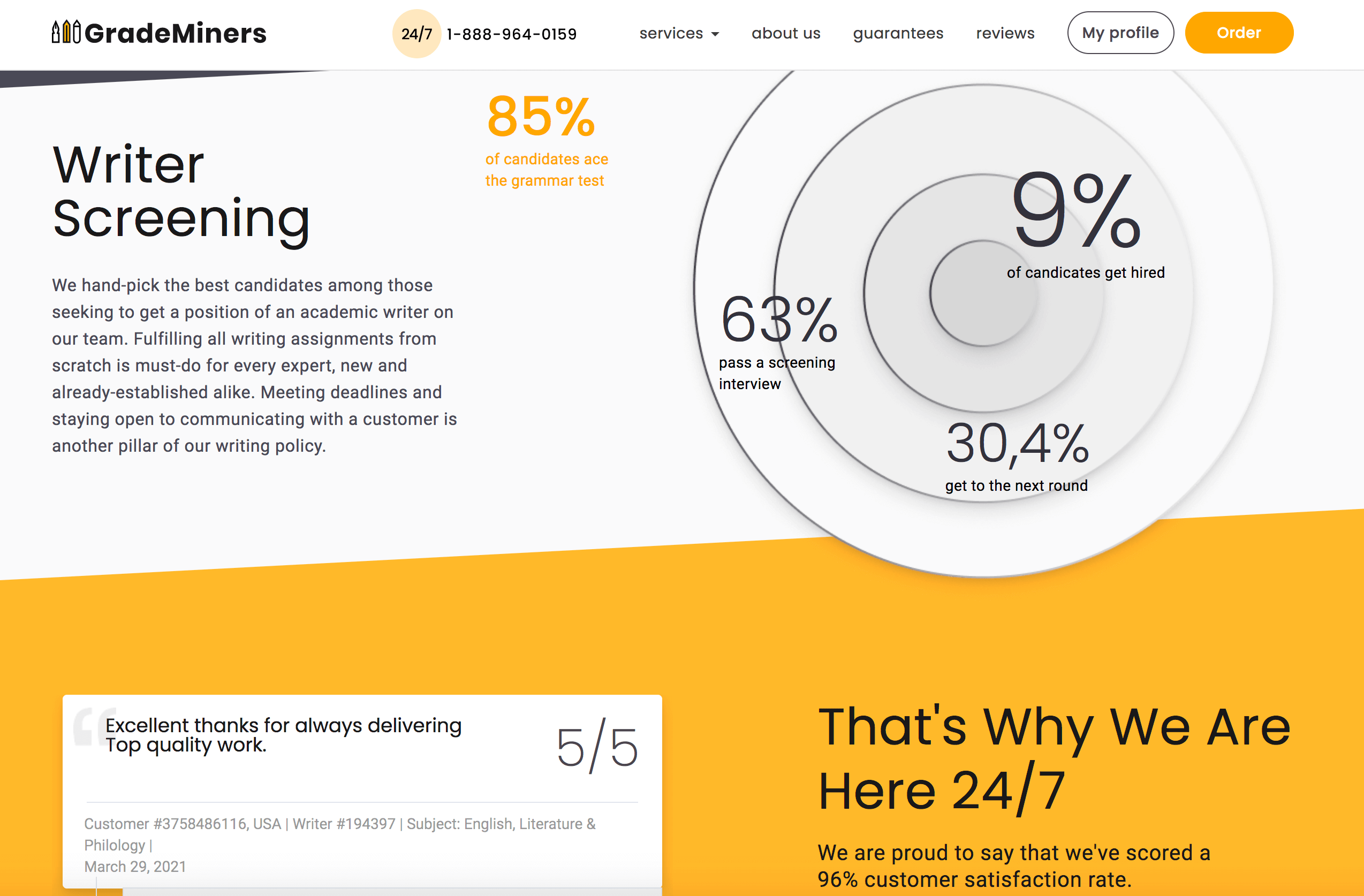 When they want to place an order, most clients first read reviews, get recommendations, and check testimonials. The best thing about Grademiners is that more than 90% of reviews are positive. Thus, clients check the list of positive comments and immediately place an order. It is all because of hardworking and diligent writers who are working for this Company.
