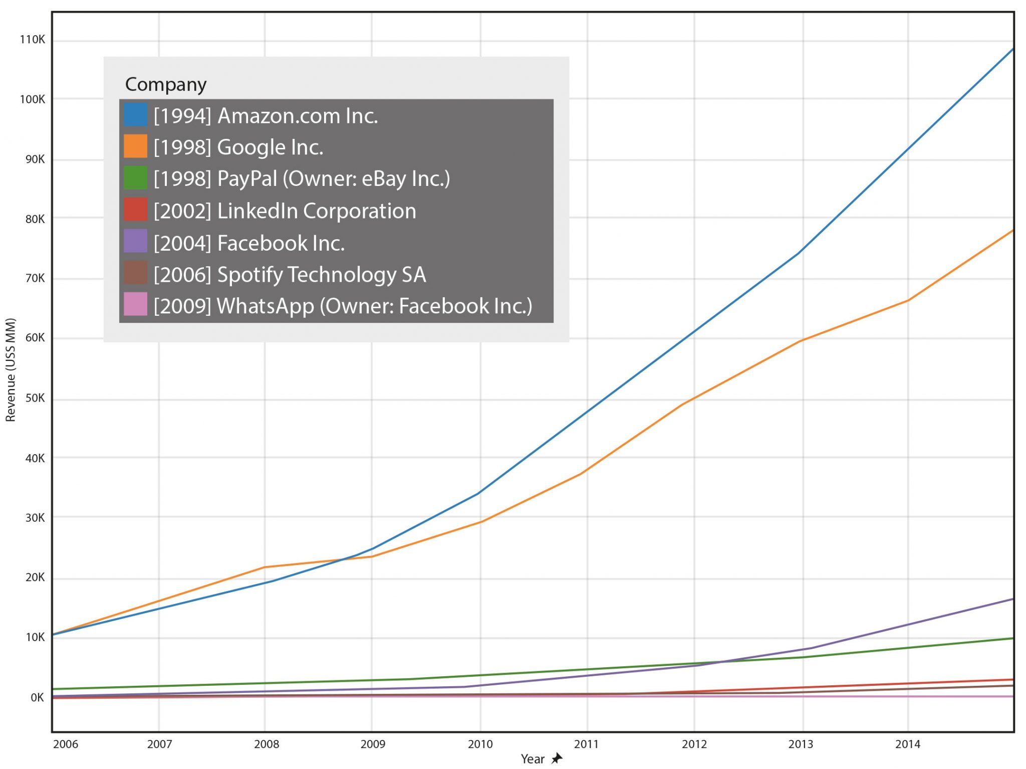 Note: the 28% revenue growth is the average of revenue growths of the selected seven organisations. Those percentages and the revenue chart are own calculations done with data and predictions coming from Bloomberg Businessweek, Orbis Database, Business Insider, TechCrunch, Money, Statista and websites of the selected companies. Additionally, for simplification, we have considered the analysis of WhatsApp and PayPal in the chart, as different companies during the period 2006-2015. However, Facebook acquired WhatsApp in 2014 and PayPal separated from eBay in 2015.