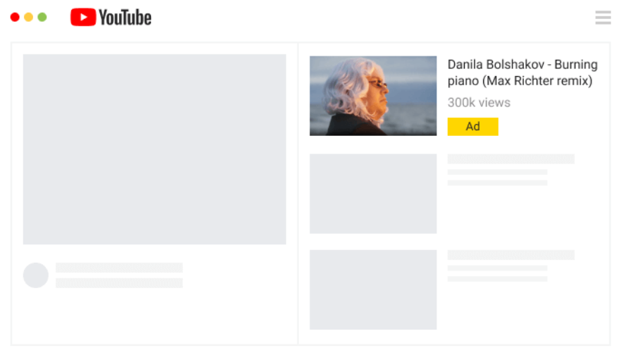 - The first option appears in search results, in a list of similar ones, on the main page of the mobile version. The video does not play automatically. The user needs to click on the ad. Using this format, you can gain subscribers and social activities (likes, comments, reposts);