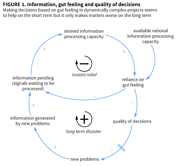 However, when the next phase in the project approached, it became clear that the short time that was allocated to this next phase was not a solution but a huge problem. This problem created more information that needed to be processed, forcing the team to rely even more on gut feeling. This is reflected by a reinforcing feedback loop that spirals the system out of control. Gut feelings lead to decisions of poor quality which cause problems that increase the amount of information that needs to be processed. This only reinforces the need to use gut feeling in dealing with the information overload. (see figure 1 below)