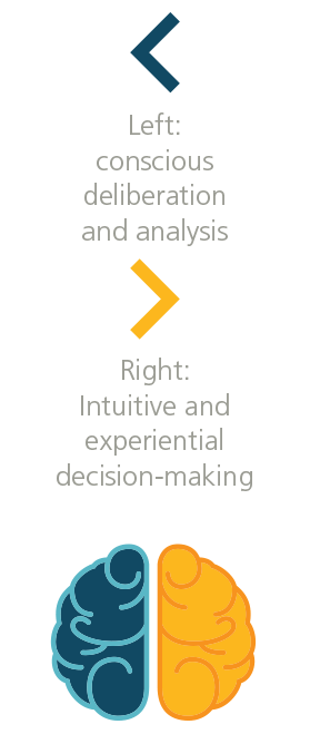 Previous research shows that decision-making improves when both the right and left side of the brain are used (Seo and Barrett, 2007; Oliver and Roos, 2005). The right side has been referred to as information processing system 1 (Kahneman, 2003). System 1 is rapid. This process is non-conscious, with important parallels to perceptual processes and linked to intuitive and experiential decision-making (Dane and Pratt, 2007). The right side reads between the lines, uses intangible information, gut feeling and previous experiences. The left side, system 2, uses the facts: tangible, objective, and measurable information. This is the slower system and involves conscious deliberation and analysis (Dane and Pratt, 2007; Fenton-O’Creevy et al., 2011). Using both sides not only improves the speed of the decision making process, but also the quality of the decision (Damasio, 1994).