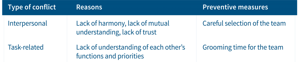 Task-related conflict can be avoided in two ways. First, by having a high degree of functional homogeneity on the team. If the team is homogeneous in terms of the functions and expertise of its members then the members understand each other’s perspectives much better. However, this may work only if the negotiation is limited in terms of functions. In many complex negotiation situations, a team needs experts from different fields. On a negotiating team, it is very common to see representatives of finance, marketing, operations and human resources negotiating together, representing the organisation. To avoid task-related conflict on a multifunctional team, it is important to give the team some grooming time. This is essential for team members to understand each other’s objectives as well as priorities. It is also important to use this mutual understanding to create common ground for negotiation. If team members negotiate with conflicting goals in mind, this will not only harm the unity of the team but also result in poor team performance.