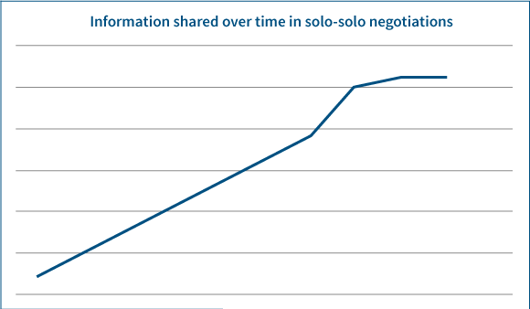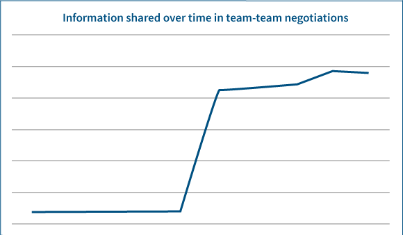 As shown in the graphs, it is difficult to share information in team negotiations. There are phases with sudden increases in information shared. As a result, it is very important to keep track of the information shared. In information sharing during a team negotiation, we observe kinks such as the ones we have seen above because, when teams negotiate, a lot of time is spent simply warming up. Later on, almost all the team members start chipping in with information and a lot of information is shared. Quite often it is difficult to keep track of all the information that is shared. The best way to avoid such an information overload is to manage the process through role assignment.