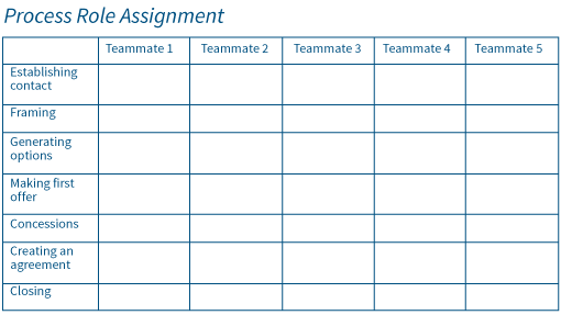 Process assignment means assigning each and every team member his or her role at each step of the negotiating process. For example, assigning someone to establish the contact, somebody to frame the negotiation or somebody to manage offers and concessions. Process assignment has two important advantages. First, no single member of the negotiating team has the pressure of taking the initiative at each and every step of the negotiation. Second, it makes everyone better synchronised with the negotiation process. It is very important for each member of the negotiating team to know his or her role in the negotiation. Clarification of each person’s role in the negotiation process involves clarity on two aspects: 1) What information do I need to explore or collect? 2) What is my role at each step of the negotiation process?