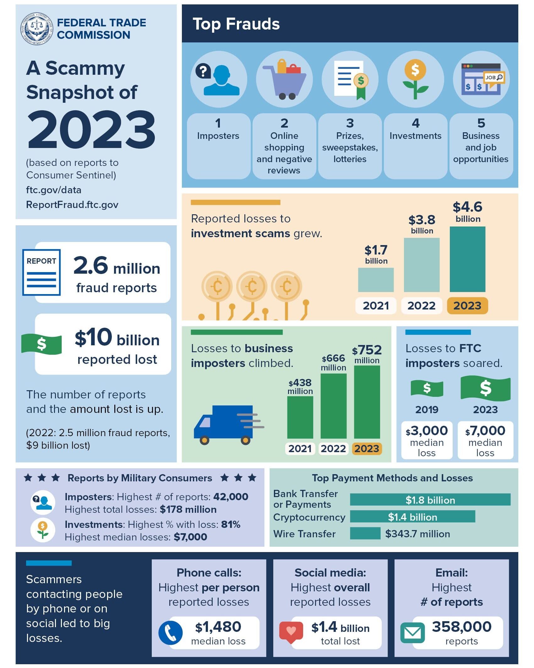 - In 2023, Americans lost $10 billion to fraud, a 14% jump from the previous year, according to the Federal Trade Commission (FTC).