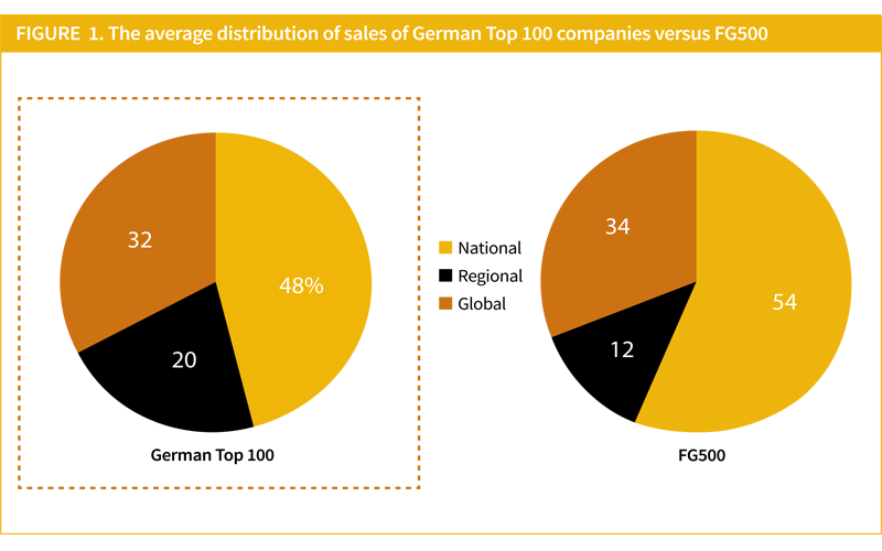 In relation to sales, we gathered information on the geographic distribution of revenues reported in each company’s annual report9 and distinguished among sales within the firm’s home-country (national), international but within the home region (regional), and outside the home regional boundaries (global).10 The comparison (see Figure 1 previous page) shows that German companies’ average revenue distribution is similar to the one of the average FG500 firm with respect to the propensity to go global. Having said that, differences arise when looking at the proportion of national and regional sales. Whereas German corporations tend to be relatively less nationally-oriented than their FG500 counterparts, they show a greater propensity to operate within their home region, this being the likely result of the high level of regional integration within the European Union.