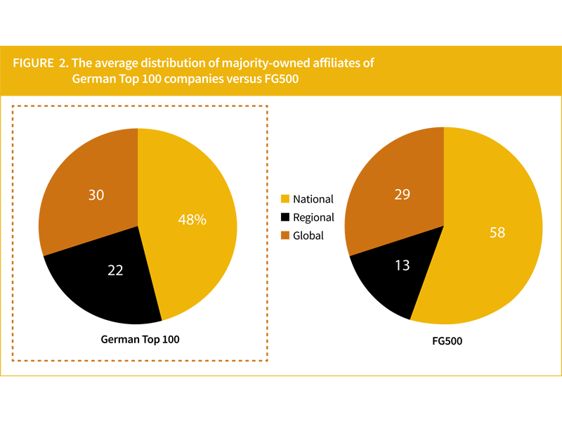 We then considered the geographic distribution of subsidiaries and thus created a dataset that included all majority-owned affiliates of the 100 largest German firms (over 19,000 data points) and did the same for the companies included in the FG500 (the resulting dataset for the FG500 sample comprised over 67,000 data points). We calculated the distribution for each firm in the two samples and reported the resulting averages in Figure 2 above. The pattern that emerges is comparable to the one obtained relative to the distribution of sales. Whereas significant differences are noticeable in the national versus regional orientation, the propensity to locate majority-owned affiliates outside the home region is practically identical in both samples.