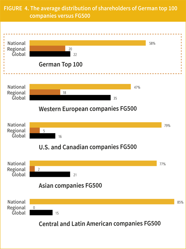 We also considered shareholders’ nationality as their geographic distribution may provide a useful indicator to understand the international orientation of firms. For this purpose, we collected data on the country of origin and total stake owned for each of the main shareholders of the 100 largest German corporations and did the same for all the companies included in the FG500. Data for the German sample were available for 73 firms (377 companies for the FG500 sample) and led to the creation of a dataset with over 2,900 data points (over 24,000 for the FG500 sample).11 The results obtained (reported in Figure 4) show that German companies have, on average, a significantly higher share of national shareholders when compared with their Western European counterparts. Moreover, our findings also illustrate that the portion of shareholders coming from outside the European Union is substantially smaller than the one of the largest Western European corporations included in the FG500. This may be associated with the fact that whereas stock exchanges in other Western European countries have merged creating larger platforms (e.g., Euronext), global investors need to access Deutsche Börse to acquire equity of German-based companies. Looking at the average geographic distribution of the largest corporations based in other world’s regions, our findings illustrate a marked predominance of national ownership, with intra-regional ownership losing relevance when moving away from Western Europe. Given the overall marked home-country bias reported across all regions, the findings we obtained suggest that the average distribution of shareholders may not be the most insightful indicator to grasp nuanced differences in the internationalisation patterns of large corporations.