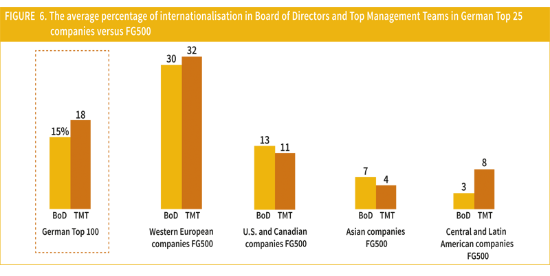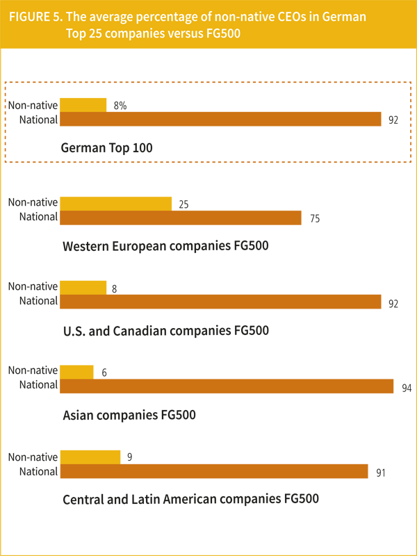 Recent research has highlighted that the C-suite of the world’s largest corporations is not as globalised as conventional wisdom may suggest.12 Looking at CEOs’ country of origin for example, only nearly 13% of companies included in the FG500 had a non-native CEO, i.e. whose main nationality was different from the country where the corporation had its headquarters. Figure 5 below reports the average percentage of non-native CEOs in the 25 largest corporations based in Germany and compares it with their FG500 counterparts. Our findings indicate that German companies have a much smaller propensity to hire a non-native CEO than other Western European corporations. Their likelihood of hiring a foreign national (8%) is equivalent to the one of North American companies, and anyway meaningfully inferior than the overall FG500 average (13%). One potential explanation for this result may be linked to the fact that German companies primarily use German as reference language in their headquarters, making it very difficult for international CEOs to be hired unless they are fluent in German. Not surprisingly, 70% of the non-native CEOs in Western European companies included in the FG500 are based in the U.K., Netherlands, and Switzerland – three countries where English is commonly used in the headquarters of large corporations.