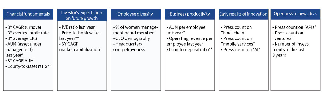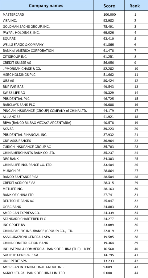 Notes * For payment companies, we use “the amount of transactions” as a proxy. **We treat payment companies differently than other financial service companies. All of our 21 indicators are hard data; that is, they are publicly available in company websites, annual reports, press release, news, and special reports on topics such as corporate social responsibility. For press counts data, we consulted Factiva, a global news database that covers various premium sources, and counted the number of press releases on each trending topic that was identified previously in this sector for the past 3 years (2016–2018). The data was also supplemented by third-party data sources from Crunchbase, which specialises on the topic of corporate venturing. To calculate the index, first, we collected historical data for each company. Then we performed calculations for each indicator (e.g., 3Y CAGR) before we standardised the criteria data. Next, we aggregated indicators to the six main factors and then determined the overall ranking. For the purpose of comparison, we ranked each company from 1 (best) to 44 (worst) on a scale of 0 to 100.