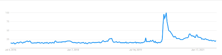 A Google Trends graph shows that in the United Kingdom for the last five years, online shopping has had a dramatic increase throughout March and April 2020, right in the midst of the pandemic, and then it was gradually decreasing.