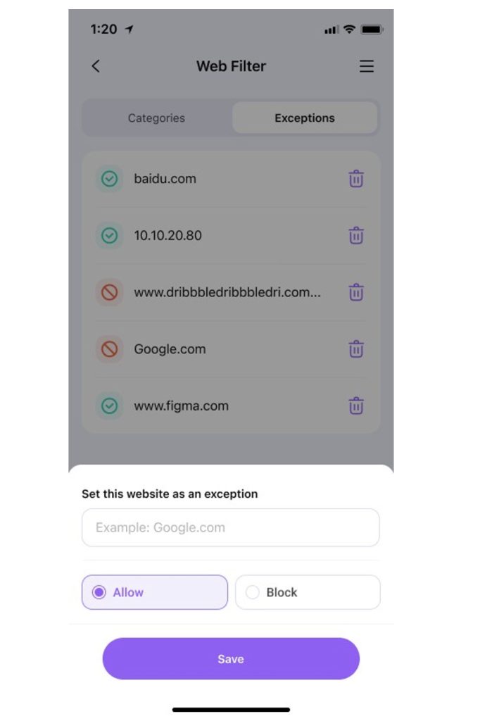 Step 2b: Under Exceptions, add a website by tapping Add Exception. This feature can block pornographic websites from your kid’s device. Enter the website URL, then choose whether to Allow or Block access. Once done, tap Save.