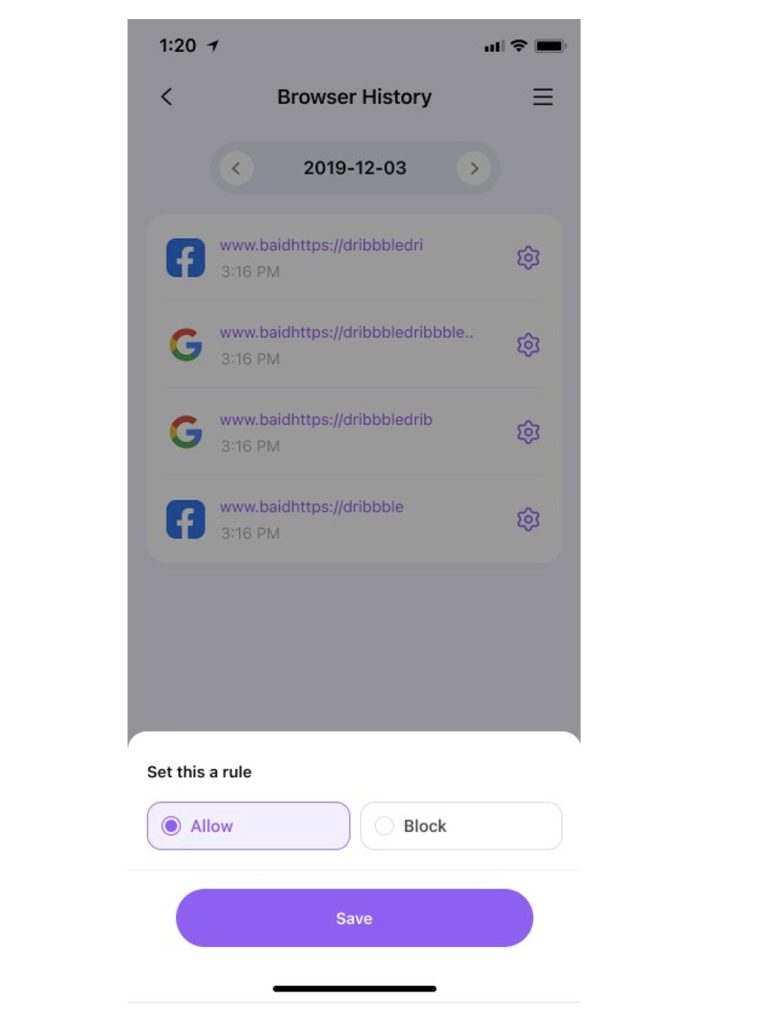 Step 6: If you find a website you want to be blocked on your kid’s device, tap the “gear” icon beside the website and set the rule on whether to Allow or Block access. Once done, tap Save to finish.