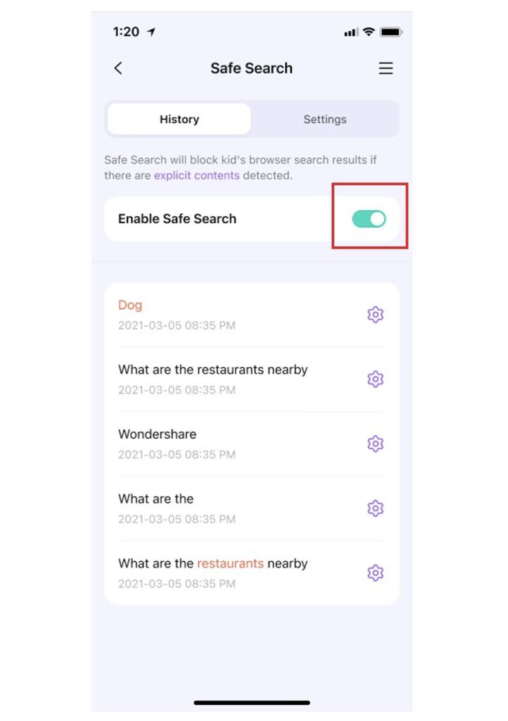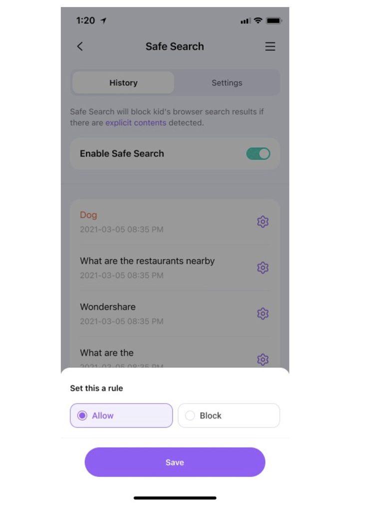 Step 4a: Allow or Block a search word under the History tab. To do this, tap the “gear” icon beside the word, and set the rule on whether to Allow or Block the word from appearing in your kid’s browser search results. Tap Save once done.
