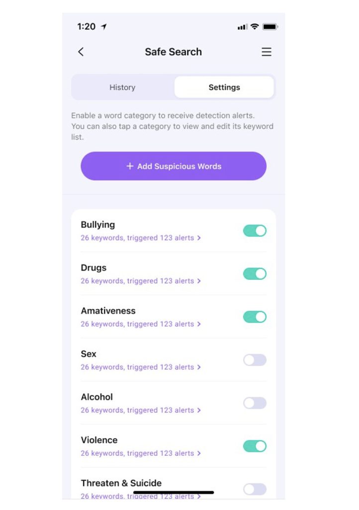 Step 4b: Under the Settings tab, you will find the suspicious words library. To receive alerts, enable the FamiSafe-sorted categories. You can also add other words you find suspicious by tapping the Add Suspicious Words button.