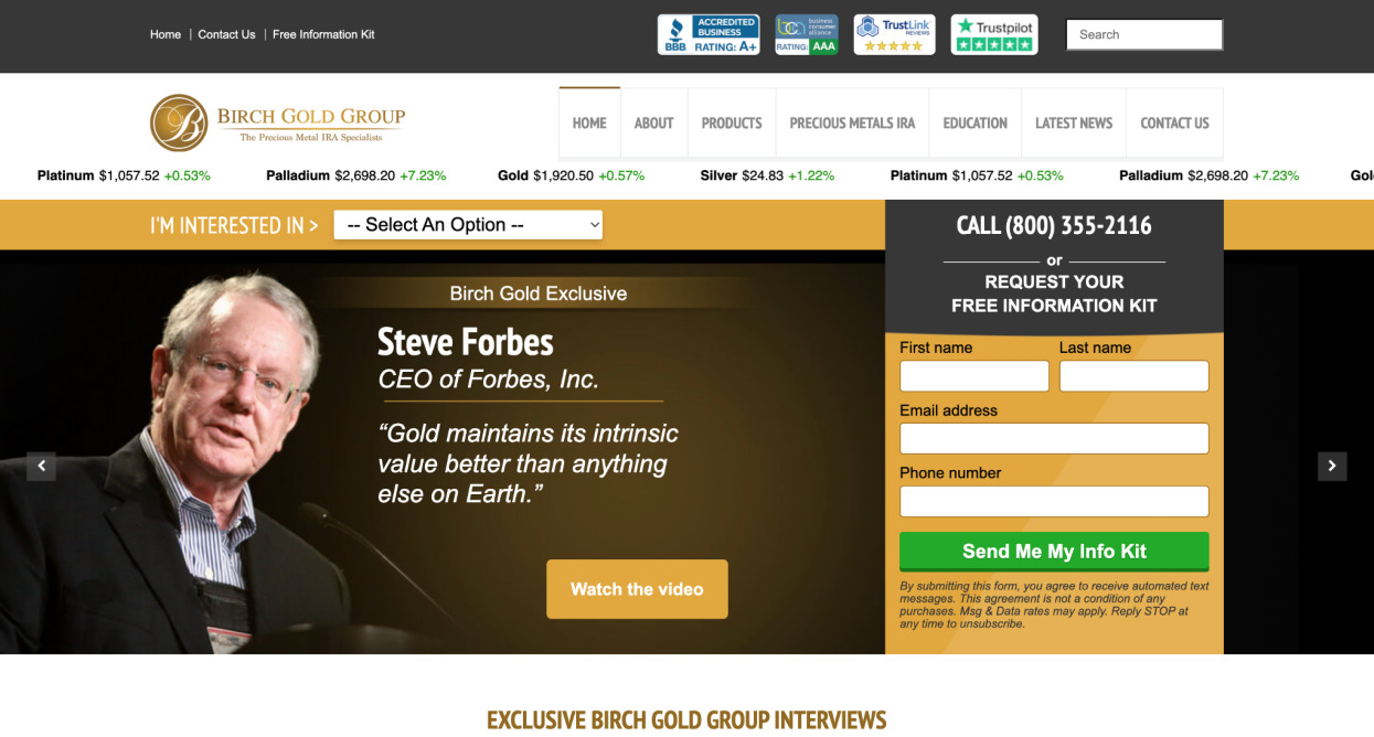 The company is headquartered in California and was founded in 2003. BirchGold brands itself as a specialist in IRAs backed by precious metals. It has a dedicated department catering to precious metals IRAs, and the company has experts in this field should you need to consult someone. There is a partnership with multiple depositories, and the grade of gold and other metals offered is also quite diverse. There is a lot of educational content that is being provided for free.