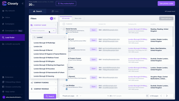 You can look up emails (direct and work), phone numbers, company data, FB and LI profiles. It also has an extension that scrapes data from LinkedIn – it’s called Closely Surfer and it’s available in the Chrome Store. This extension lets you open contact data on LinkedIn pages.