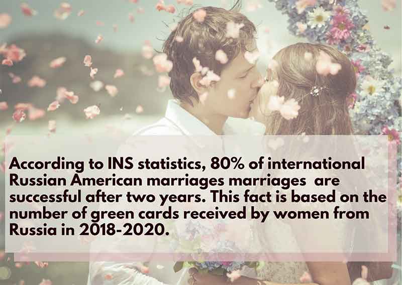 An American marrying a Russian girl isn’t a phenomenon anymore. Moreover, based on the latest statistics, such relationships are stronger than those with local guys. Based on Statista, in 2020, 5.3 marriages were registered per 1,000 people in Russia, compared to 3.9 divorces per 1,000 country citizens. The situation is different with mixed Russian American marriages. According to INS statistics, 80% of international marriages with Russian wives are successful after two years. This fact is based on the number of green cards received by women from Russia in 2018-2020.