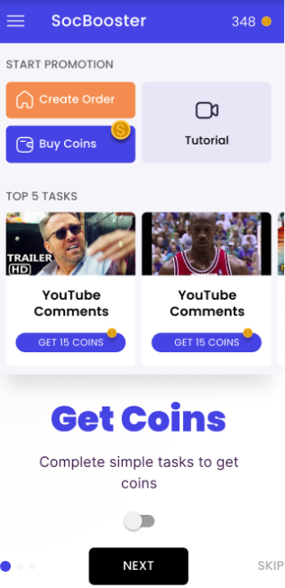 Platforms with a tasking system are a kind of free promotion. You perform tasks (like, subscribe and etc.), get virtual coins, and exchange them for your promotion. Free application SocBooster for growing YouTube channels works according to this principle. For example, with SocBooster it’s possible to buy YouTube views, comments, followers, watch time at no cost.