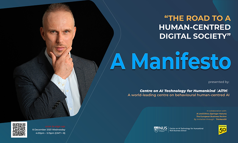 At the Centre on AI Technology for Humankind (AiTH; https://bschool.nus.edu.sg/aith/), we have been discussing and examining this state of discourse on AI ethics and trustworthiness, the unquestioned dominance of Big Tech, and the deficiencies of techno-solutionist and machine-centred approaches to AI for some time now. These efforts have inspired us to write a manifesto: a public declaration of AiTH’s thinking on what is needed (and why) to employ a distinctive and legitimate human-centred approach to the adoption and integration of intelligent technologies in our businesses and society.