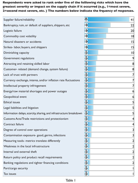 These findings are not surprising given that firms in this study showed that a wide variety of information-based technology and applications are being spent for their SCM efforts (e.g., ERP configuration systems, electronics reverse auctioning, radio frequency identification, Collaborative Planning Forecasting and Replenishment – CPFR, etc.), but very few firms showed that their technologies are being used to support risk considerations. Respondents agreed that the key to improved supply chain visibility was sharing information among supply chain members.