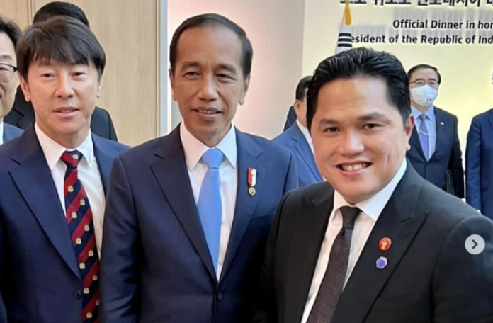 Indonesian president Joko Widodo (centre) and PSSI Chairman and Minister for State-Owned Enterprises Erick Thohir (right)