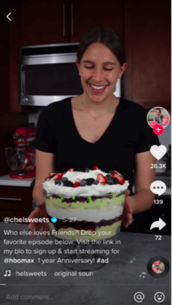 Baker Chelsey White recently worked with HBO Max to celebrate Friends: The Reunion. Chelsey filmed herself baking some iconic recipes from the show. Her voiceover talks about how she’s been enjoying watching Friends on HBO Max, and mentions HBO Max’s one year anniversary. The video got a lot of engagement and was a delicious and effective way for HBO Max to advertise.