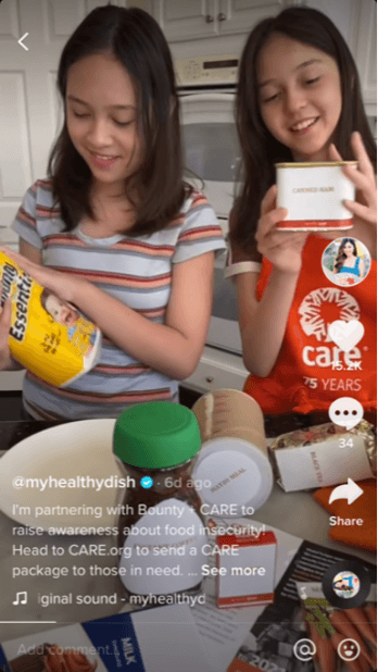 MyHealthyDish, a chef, author, and actress with 2.9 million TikTok followers, recently partnered with Bounty + CARE to raise awareness about food insecurity. MyHealthyDish and her twin daughters made a TikTok video showing how they used Bounty paper towels to make a meal. Then the video explained how CARE sends care packages to people who need them and how viewers could participate.