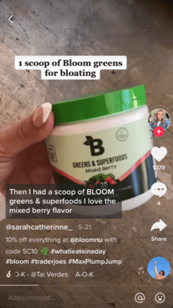 Sarah Van Den Berg is a popular TikToker in the fitness and wellness industry. She recently created a “What I Eat In A Day” video and slipped in a promotion for BLOOM Greens and Superfoods, tagging Bloom Nutrition and providing a discount code for her followers to use. Since Sarah’s followers are likely highly interested in health and nutrition tips, this was a great way for BLOOM to advertise its product.