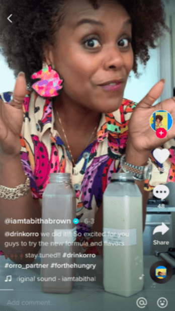 Actress Tabitha Brown amassed quite the social media following in 2020 — including 4.7 million TikTok followers — with her videos and other content that frequently focuses on veganism. In this TikTok, she worked with the plant-based drink Orro to advertise the drink’s new formula and flavors.