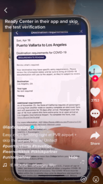 Michelle, a luxury travel TikToker, partnered with United Airlines to make a video for her 551,000 followers. She walked her viewers through the process of getting a COVID test outside the Puerto Vallarta airport and uploaded the test results directly into the United app. This is a valuable piece of content for her followers, who are probably ready to start traveling again after the COVID-19 pandemic.