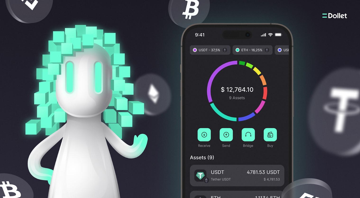 Dollet isn’t just a wallet; it’s a digital companion. With its pixelated blockchain-inspired hair, Dollet stands as the symbol of innovation and security.