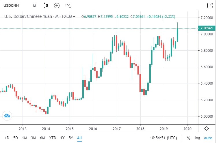As you’ll see from the currency chart, since 2014, the Chinese Yuan has risen from 6.01 to a high of 7.13 this month. To put that into context the price hit rock bottom of 1.53 in 1981.