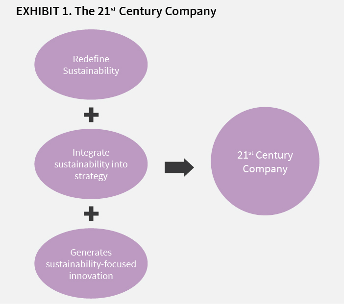 The first step to ensuring a company’s survival in the 21st century is to fundamentally rethink the definition of sustainability and its role in the company. The next steps are to integrate sustainability into strategy and generate 21st century sustainability-focussed innovation. The result will be the 21st century company.