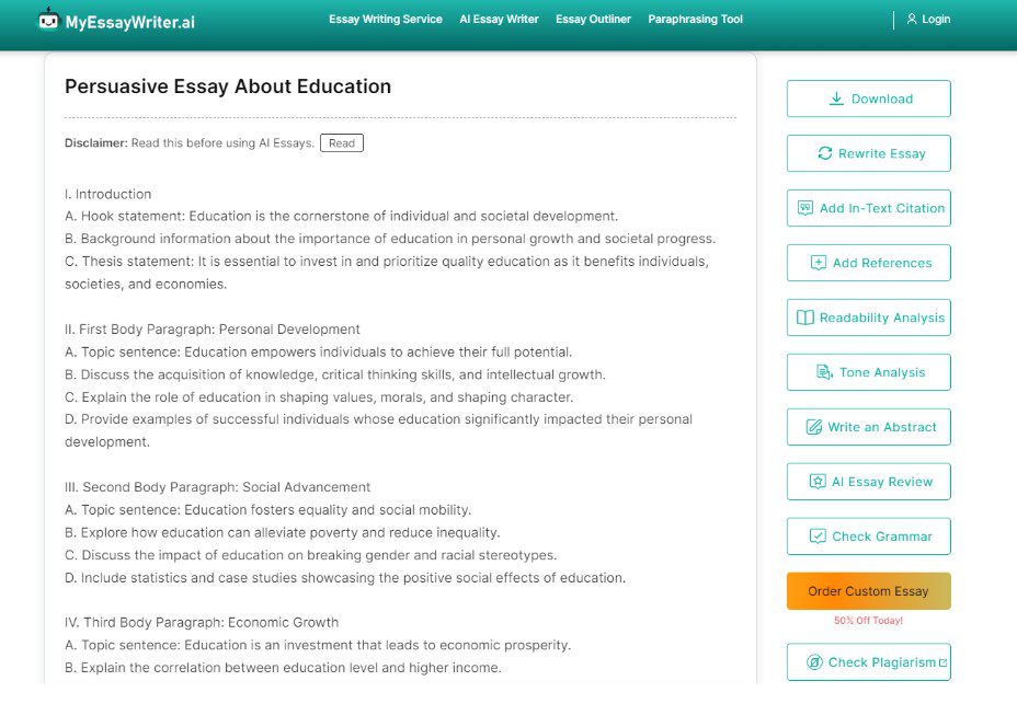 To provide a practical example, here is the response we received from this tool when we asked it to provide an outline for an “argumentative essay on education”: