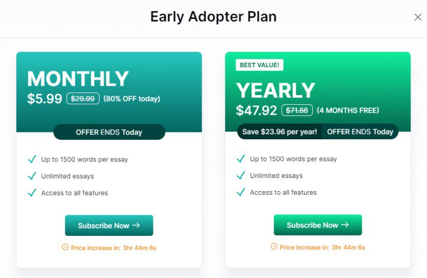 Once you’ve signed up, it’s time to select the plan that suits you best. MyEssayWriter.ai offers two options: a monthly plan and a yearly plan.