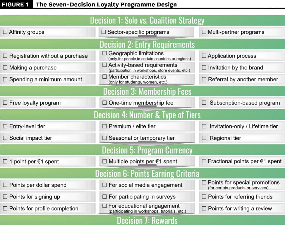 To develop a basic loyalty programme design, it is recommended to follow a seven-decision process, which is illustrated in Figure 1 and also outlines the main options available to brands at each stage.