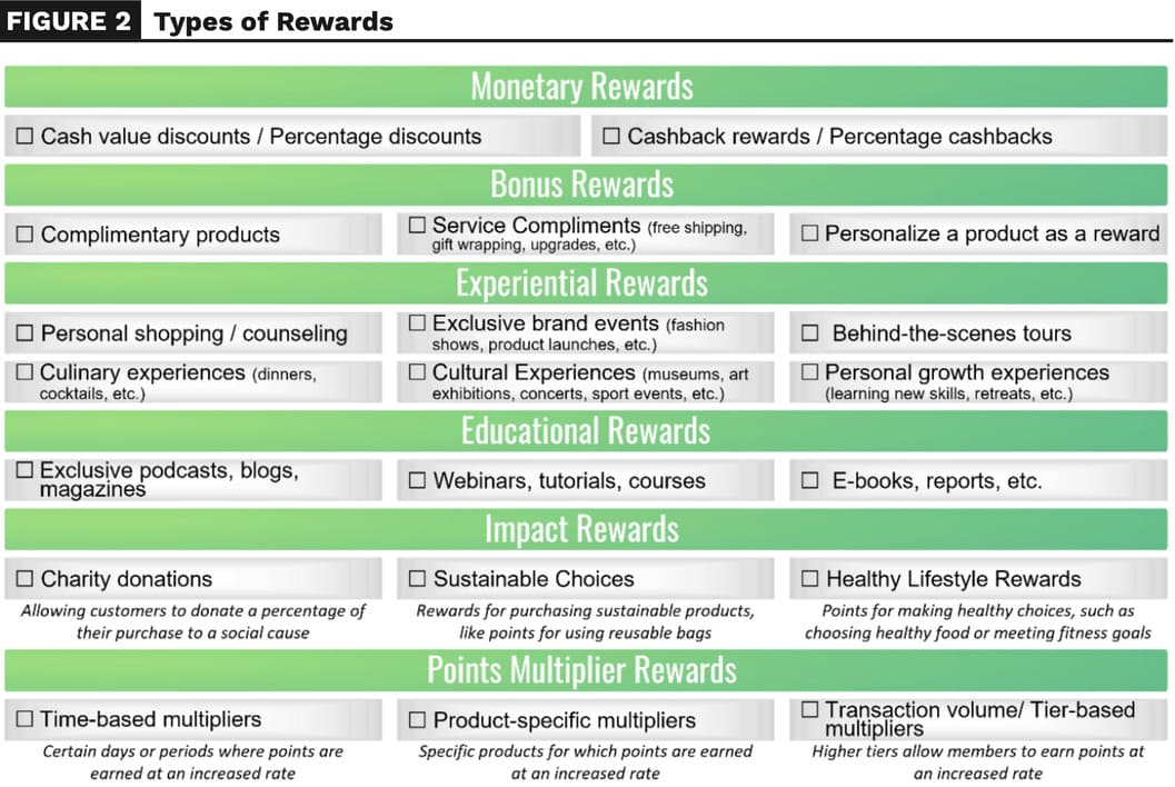 Loyalty point programmes allow customers to accumulate points, which can be redeemed for various rewards. The nature of these rewards is critical, as it significantly influences subscription rates and active engagement with the loyalty programme. Figure 2 presents an overview of the types of rewards that brands can offer their members.