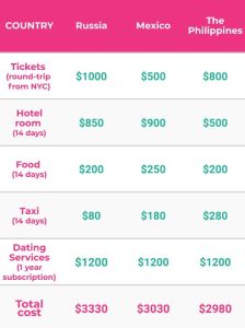 Is mail order marriage worth it? It’s always up to you. Note that the prices for the trips and brides in these countries are the average regional prices—that how much you’re going to spend to find a woman for dating in Europe ($3,500-5,500), most countries of South America and the Caribbean ($3,000-5,000), and developing Asian countries ($3,000-5,000, in China, Korea, and Japan will be much higher) on average.
